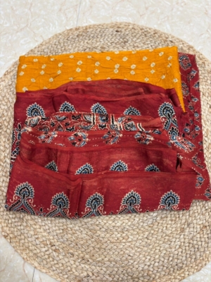 Ajrakh Bandini sarees are steeped in history and cultural significance. Rooted in the traditions of Gujarat and Rajasthan, this handcrafted masterpiece symbolizes an ancient fusion of heritage, craftsmanship, and storytelling. The intricate patterns and vivid colors used in the design carry deep cultural symbolism, making each saree a living testament to India’s diverse textile artistry.