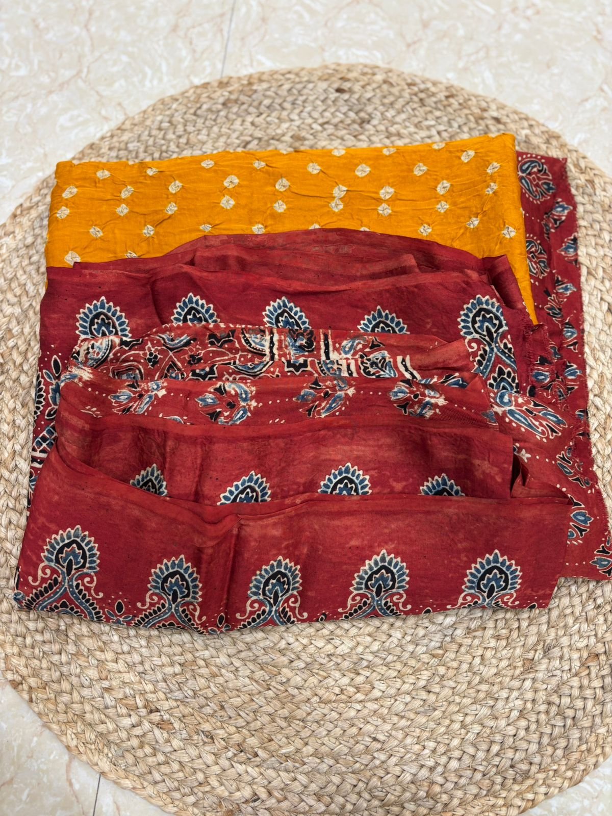 This luxurious silk saree pairs beautifully with gold or oxidized jewelry, enhancing its regal aura. Wear it for weddings, festive occasions, or grand celebrations, and let the rich hues of the Ajrakh Bandini design make a statement. For a more contemporary look, style it with a sleek, modern blouse, while keeping the traditional elegance intact.