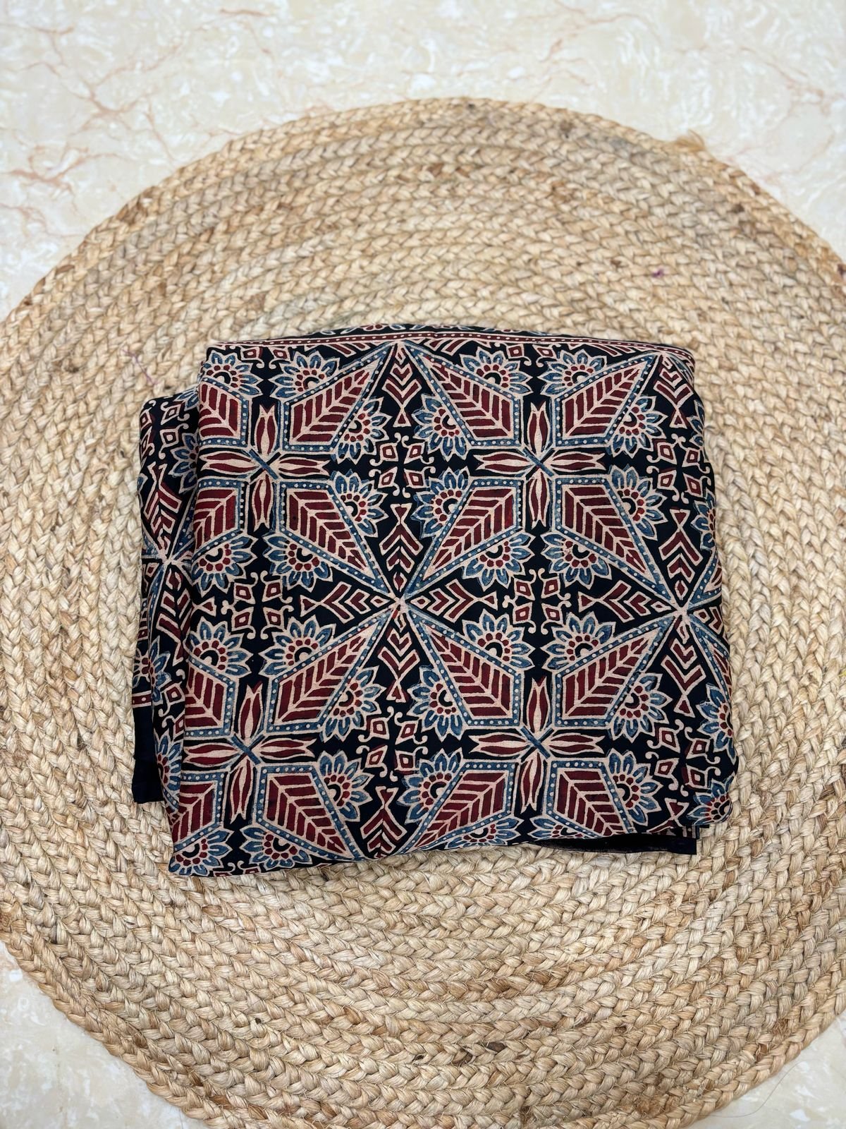 The saree features intricate Ajrakh hand-block printing, a traditional technique that involves stamping the fabric with hand-carved wooden blocks. This process results in symmetrical patterns and geometric designs, often incorporating motifs like stars, flowers, and trellises. The rich color palette, including deep blues, reds, blacks, and whites, is achieved using natural turn0search8**Cultural Significance**