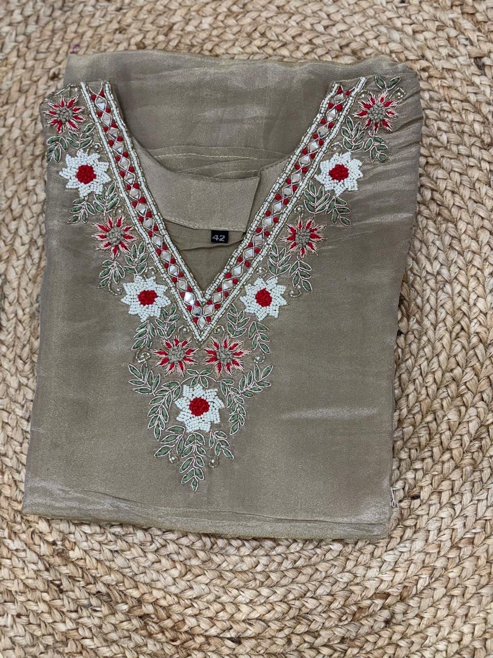 Made from a delicate shimmer tissue fabric, this kurti captures the light beautifully, offering a graceful, ethereal sheen. The fabric’s lightweight texture ensures ultimate comfort while exuding a regal charm. The kurti’s handwoven details not only showcase the fine skills of Indian artisans but also speak volumes about the craftsmanship that is deeply rooted in India’s rich textile traditions.