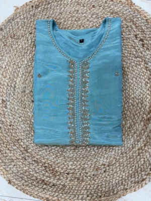 Made from a delicate shimmer tissue fabric, this kurti captures the light beautifully, offering a graceful, ethereal sheen. The fabric’s lightweight texture ensures ultimate comfort while exuding a regal charm. The kurti’s handwoven details not only showcase the fine skills of Indian artisans but also speak volumes about the craftsmanship that is deeply rooted in India’s rich textile traditions.