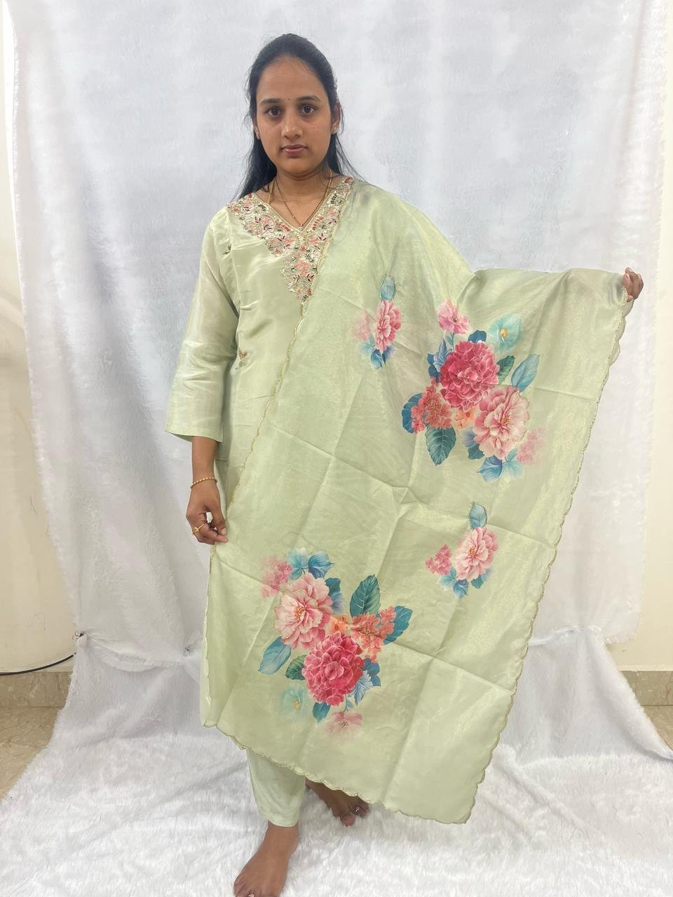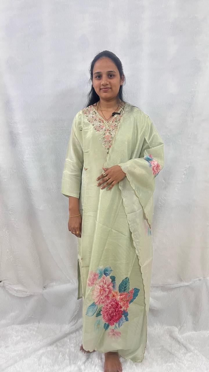 Made from a delicate shimmer tissue fabric, this kurti captures the light beautifully, offering a graceful, ethereal sheen. The fabric’s lightweight texture ensures ultimate comfort while exuding a regal charm. The kurti’s handwoven details not only showcase the fine skills of Indian artisans but also speak volumes about the craftsmanship that is deeply rooted in India’s rich textile traditions.